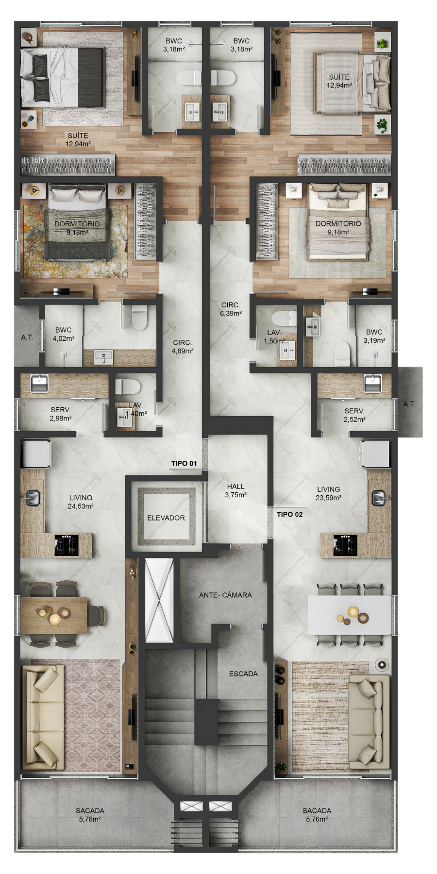 Os apartamentos possuem 80m² privativos, distribuídos em duas suítes e ambientes integrados que valorizam a luz natural e a ventilação. O acabamento é de alto padrão, com porcelanato, fechaduras digitais, e aquecimento a gás, garantindo conforto e segurança para o seu dia a dia.