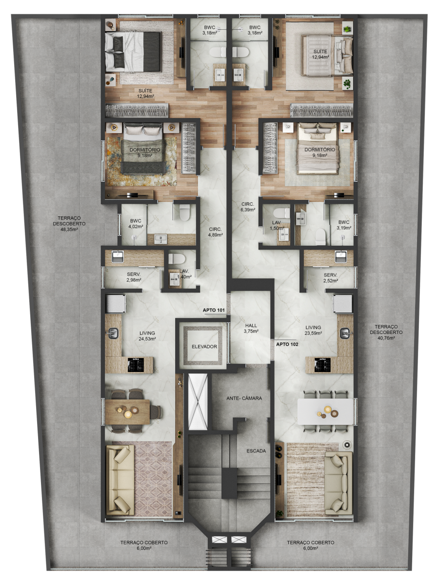 Com aproximadamente 110m² de área privativa, os apartamentos do Residencial Maya oferecem conforto e funcionalidade em cada detalhe. A planta contempla duas suítes e um terraço privativo, proporcionando mais privacidade e comodidade para os moradores. A vista definitiva para o mar é um dos grandes destaques, apreciada tanto da sala quanto da sacada frontal, ideal para momentos de relaxamento à beira-mar. O acabamento foi cuidadosamente selecionado, com piso em porcelanato nas áreas sociais e piso vinílico nos dormitórios, garantindo elegância e conforto térmico. O apartamento já conta com infraestrutura para ar-condicionado split nos quartos e na sala, aquecimento de água a gás e fechadura digital, que une praticidade e segurança no acesso à unidade. Um espaço pensado para quem busca viver com qualidade, estilo e a melhor vista de Navegantes." data-tamanho="110m²" alt="Planta Apartamento Tipo Diferenciado. ">
