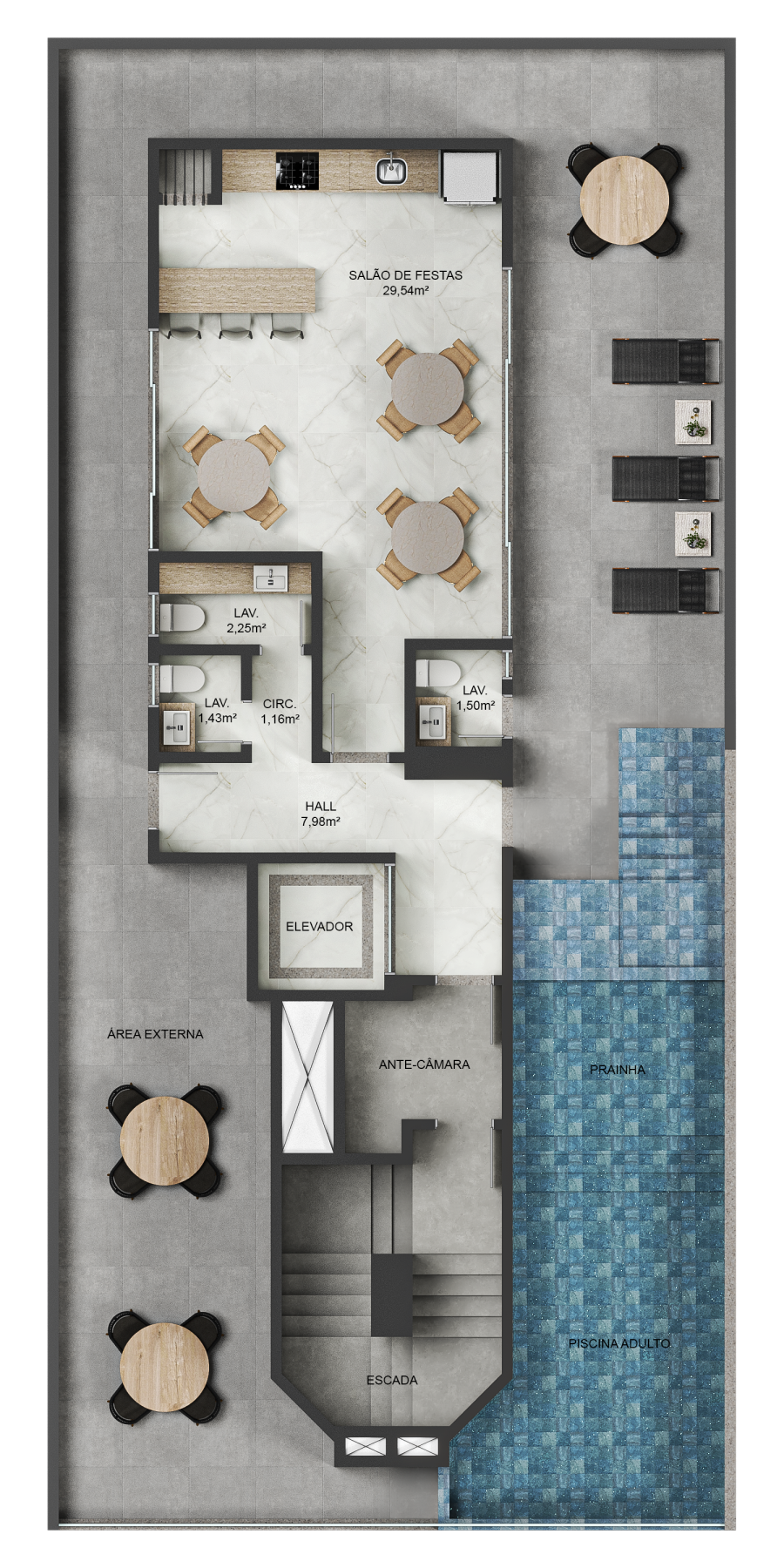 O edifício conta com um rooftop exclusivo, onde você pode relaxar na piscina com vista panorâmica ou celebrar bons momentos no salão de festas. Um espaço projetado para aproveitar o melhor da vida, cercado pelo mar e pelo charme da cidade.